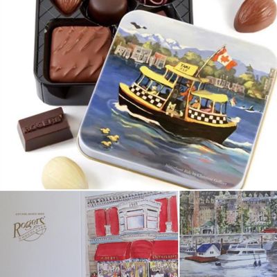 The Victoria Sketch Club extends its most hearty congratulations to our own Christine Gollner, as she is the recipient of a significant local commission. Roger's Chocolates, established in Victoria in 1885, has chosen Christine's painting "Waterfront Ride" as the design for its annual holiday chocolate box! Pictured below, this charming painting shows a classic Inner Harbour scene, complete with water taxi, ducks and even orcas. (top photo)